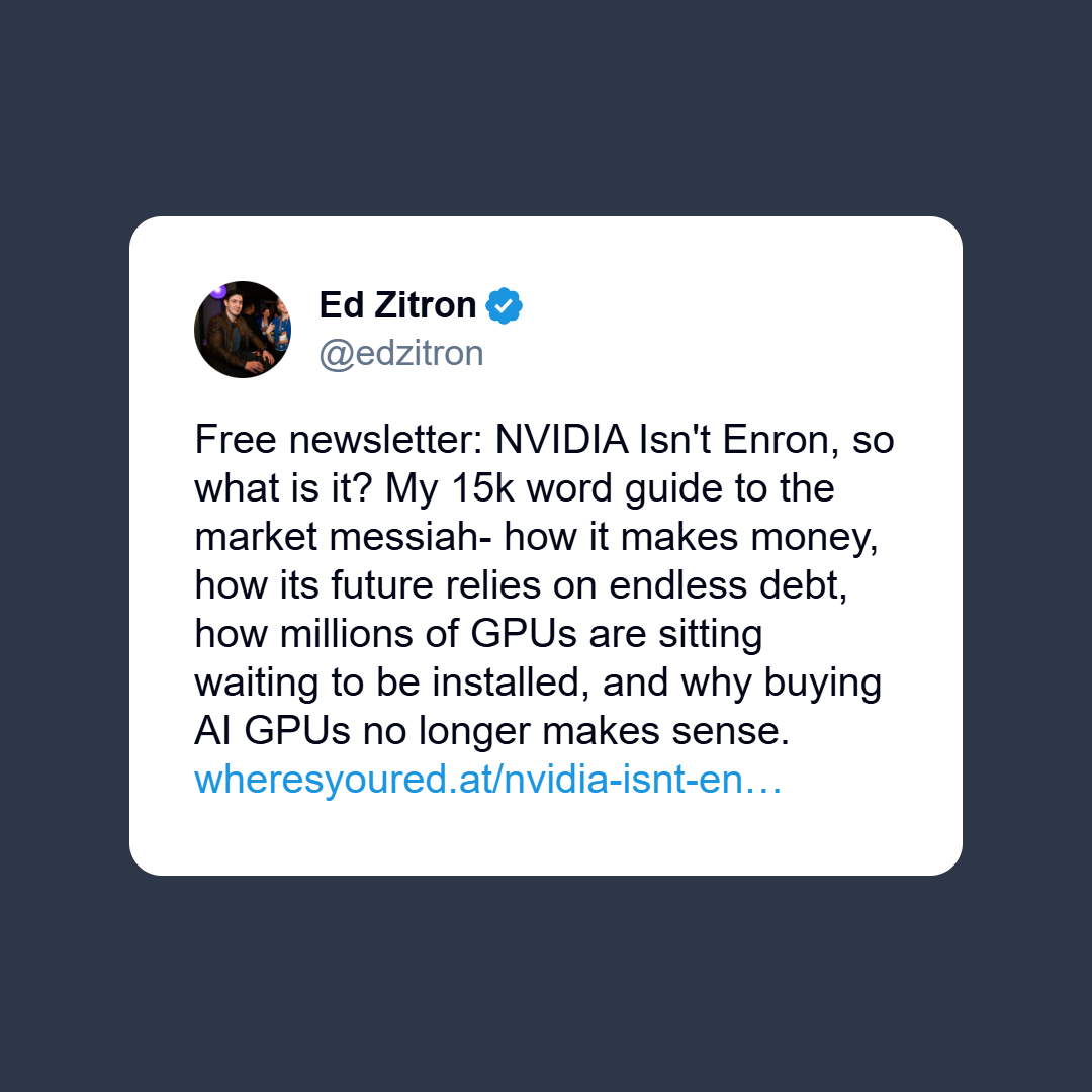 Ed Zitron dives deep into why NVIDIA keeps insisting it's nothing like Enron (which, honestly, makes people wonder even more). He breaks down the company's circular financing deals, inventory questions, and the massive GPU orders that seem to be piling up without clear profit paths. Read the full analysis.