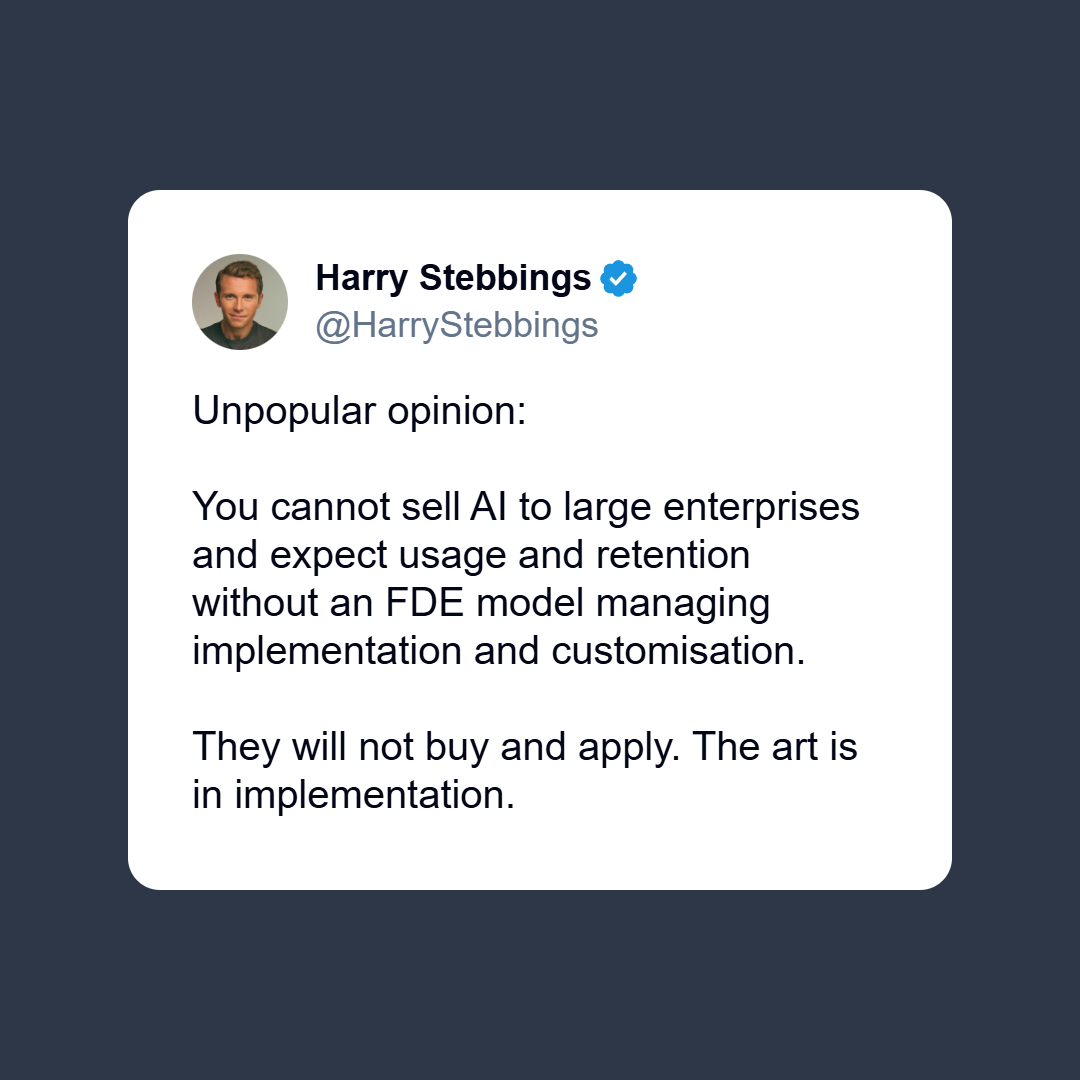 Harry Stebbings drops an unpopular truth - you can't just sell AI tools to large enterprises and expect them to stick around. Without hands-on implementation support and customization (think full white-glove service), companies won't adopt it. The art isn't in the product, it's in making it actually work for them. Explore the insight.