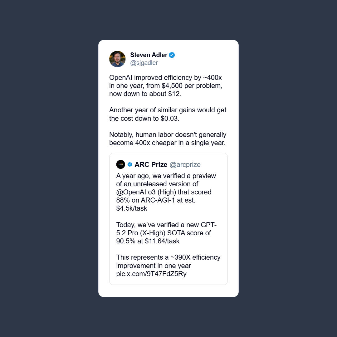 Steven Adler highlights OpenAI's massive efficiency gains - dropping from $4,500 per problem to just $12 in one year. That's a 400x improvement. The catch? Human labor costs don't drop 400x annually, creating a widening gap between what AI can do and what it costs versus human alternatives.