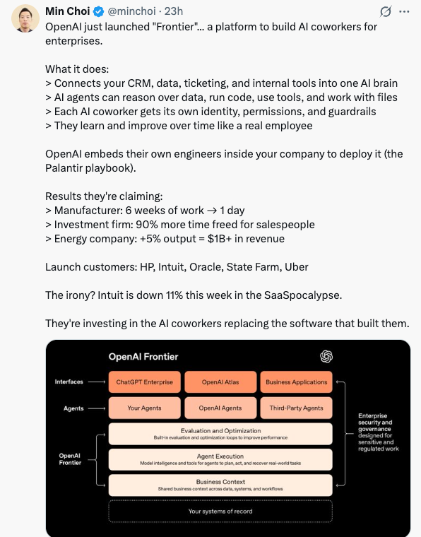 OpenAI just launched Frontier, a way for companies to create AI employees that can access their customer data, run reports, and complete tasks. The results are wild: work that used to take 6 weeks now takes 1 day. The ironic part? Intuit (the company behind TurboTax) is using it - even though these AI employees might eventually replace the software that made Intuit successful.