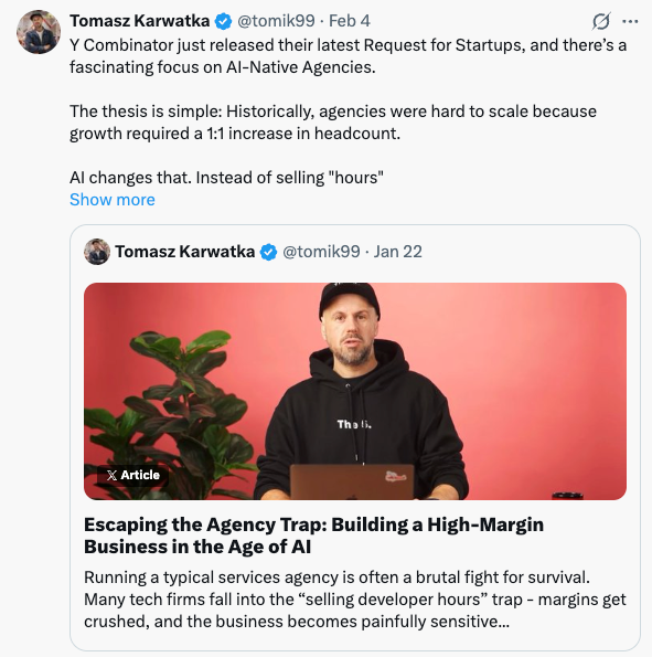 Y Combinator just released their latest Request for Startups, and AI-Native Agencies are front and center. The old model of "more clients = more people" is breaking. The new play? Use AI to deliver finished products at 100x the speed, not billable hours. Clients want the finished website or document, not access to a tool.