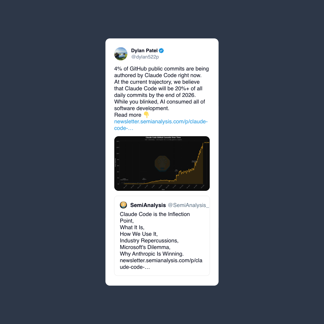 Claude Code is now writing 4% of all code shared publicly on GitHub, the place where developers share their work. It's expected to hit 20% by the end of 2026. While everyone was debating if AI could actually code, it quietly started writing a huge chunk of the world's software.