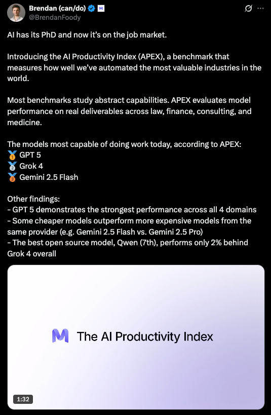 Brendan introduces the AI Productivity Index (APEX), a new benchmark that measures how well AI models handle real work across law, finance, consulting, and medicine. The winner? GPT-5 takes the crown, with Grok 4 and Gemini 2.5 Flash close behind.