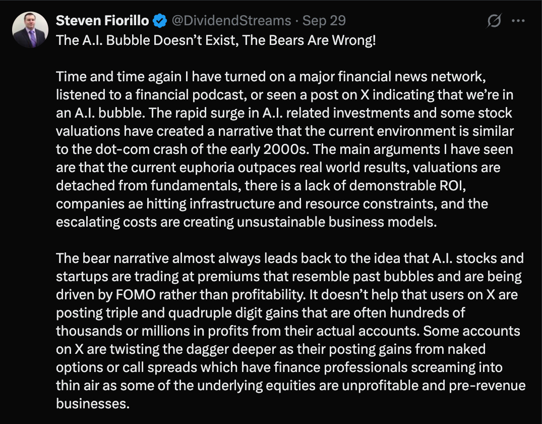 Steven Fiorillo makes a strong case that there's no AI bubble. Unlike the dot-com era, today's AI investments are backed by profitable tech giants with strong balance sheets funding growth organically.