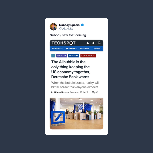 Deutsche Bank warns that the AI bubble might be the only thing holding the US economy together. A surprising turn of events considering how much doubt surrounded AI's economic impact.