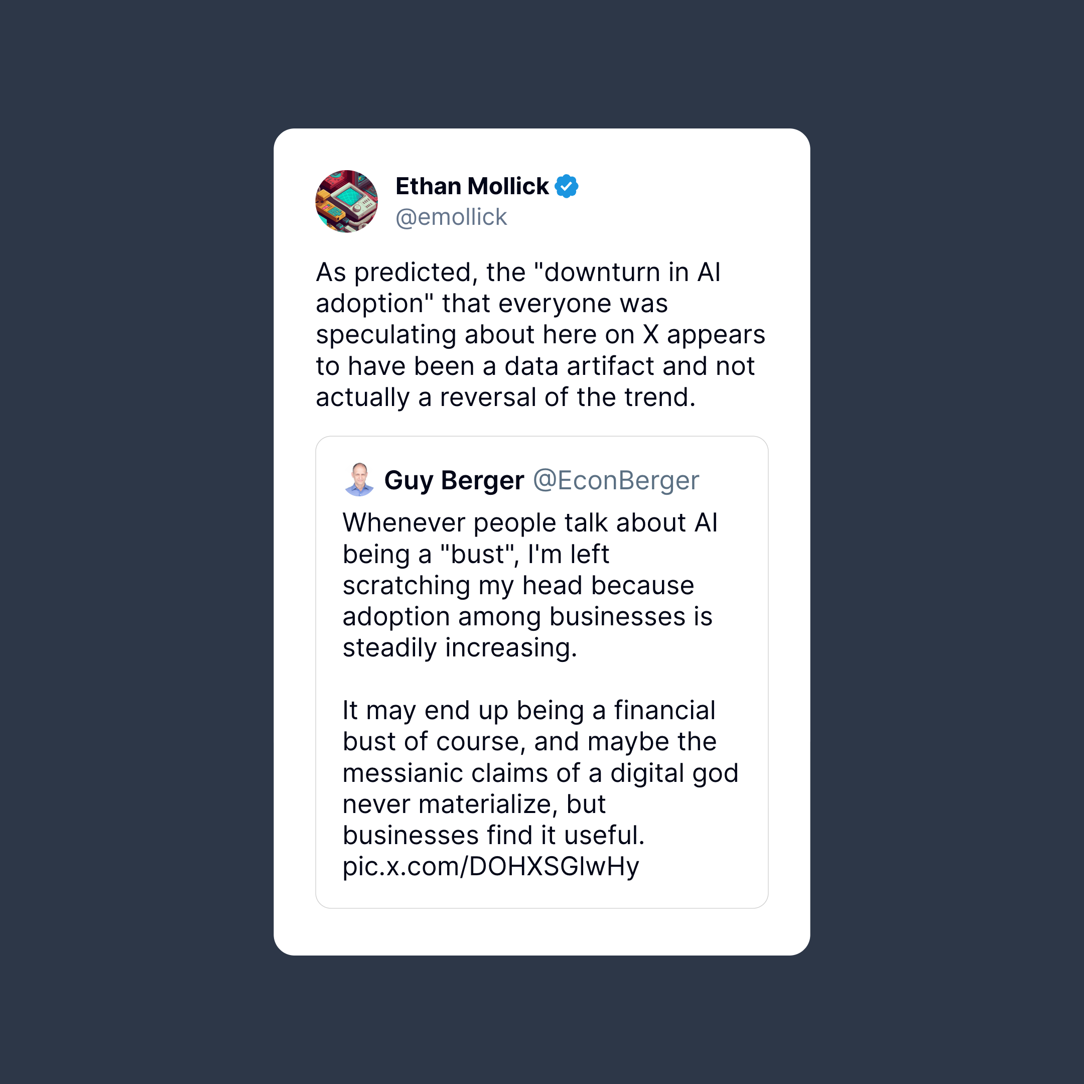 Ethan Mollick shares data showing that predictions of an "AI adoption downturn" were wrong. Businesses are finding AI useful, and adoption continues to grow. Check out the thread.