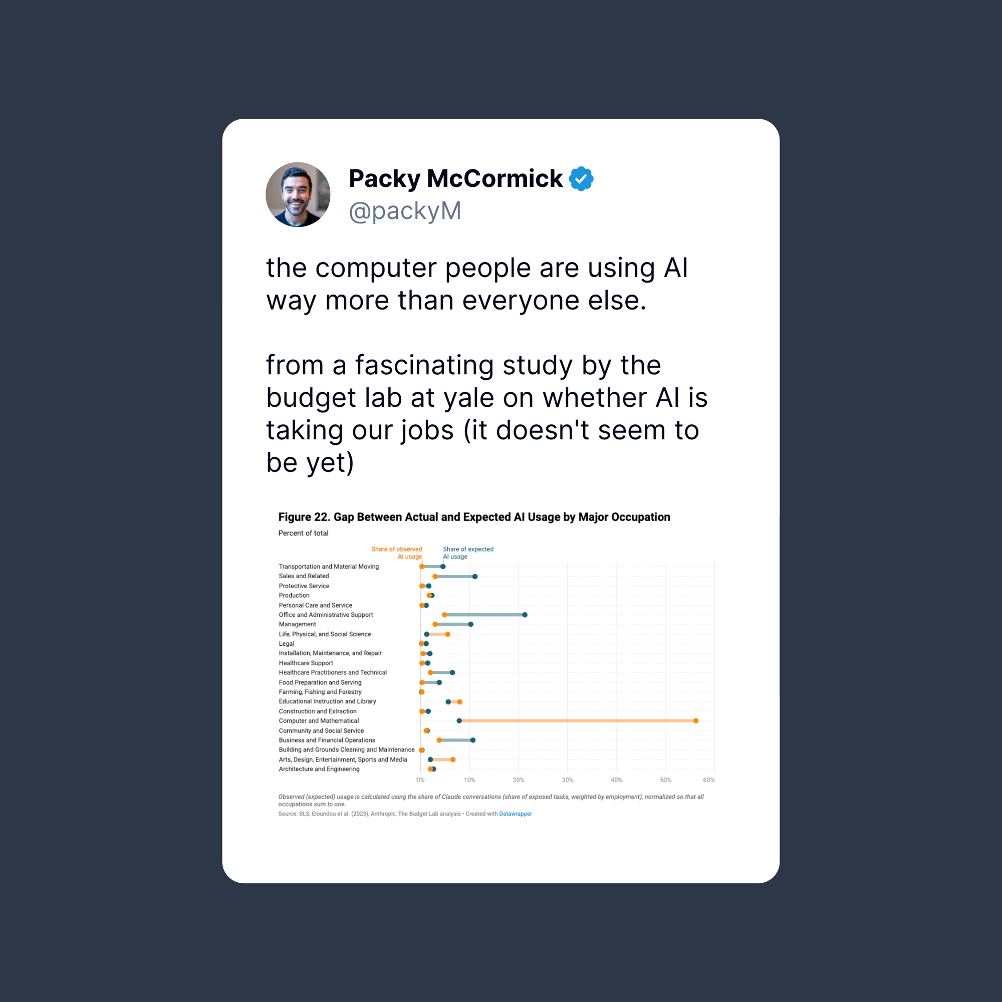 Packy McCormick highlights a Yale study revealing that computer professionals are using AI way more than any other profession. The data shows AI isn't taking jobs, but it's changing how we work.