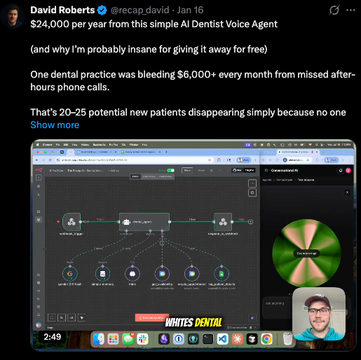 One dental practice was losing $6K monthly from missed after-hours calls. David Roberts built an AI receptionist that answers 24/7, books appointments, and handles insurance questions using n8n and ElevenLabs. Similar systems sell for $24K/year. He's giving his setup away free.
