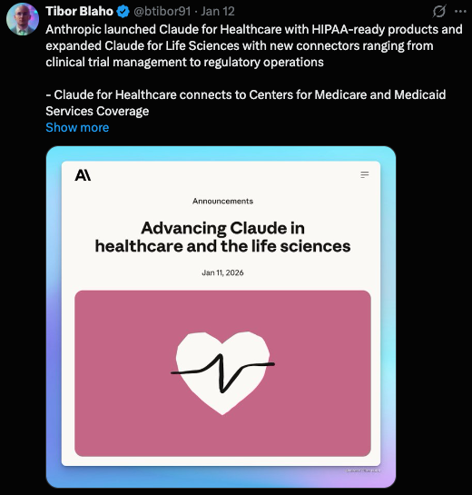 Anthropic launched Claude for Healthcare with connections to Medicare databases, health records, and medical coding systems. If you're a Claude Pro or Max subscriber, you can now connect Apple Health and Android Health data. For life sciences, new tools help with clinical trials, research papers, and pathology analysis. AI is getting real in healthcare.