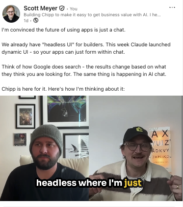 Scott believes the future of using apps is just conversation. We already have headless UI for builders, like Claude's dynamic interface that changes based on what you need. Google search works the same way, showing different results based on intent. The same shift is happening in AI chat. Chipp is building for this future, where you interact with your tools through conversation instead of clicking through menus.