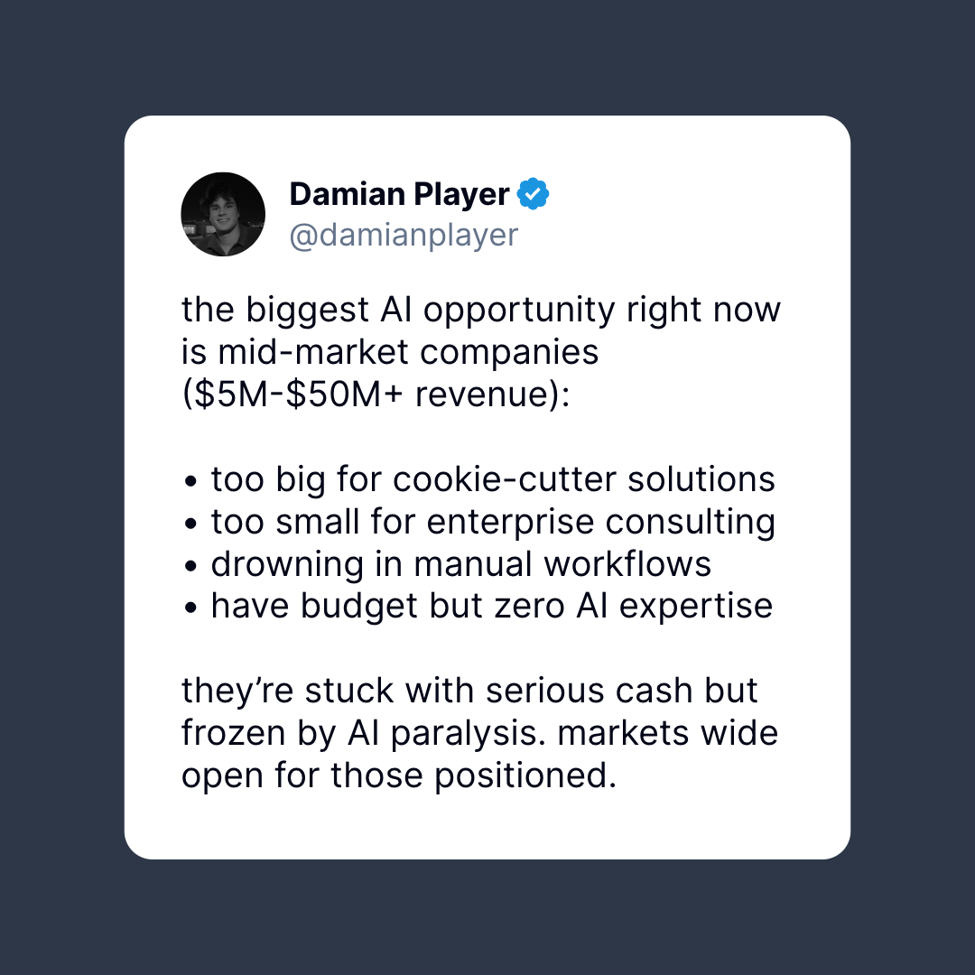 Companies making $5M-$50M are stuck. Too big for simple tools, too small for enterprise consulting, drowning in manual work, with budget but no AI expertise. Damian Player calls this the sweet spot—and he's right. These businesses are ready to pay for practical AI help, but nobody's speaking their language yet.