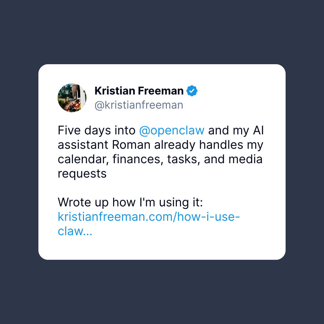 Kristian Freeman's AI assistant "Roman" runs 24/7 on his Mac, handling tasks through Telegram—managing his calendar, tracking 7,800+ financial transactions, updating his server config, and even requesting movies. Five days in and it's already become essential. The future of AI isn't chat, it's action.