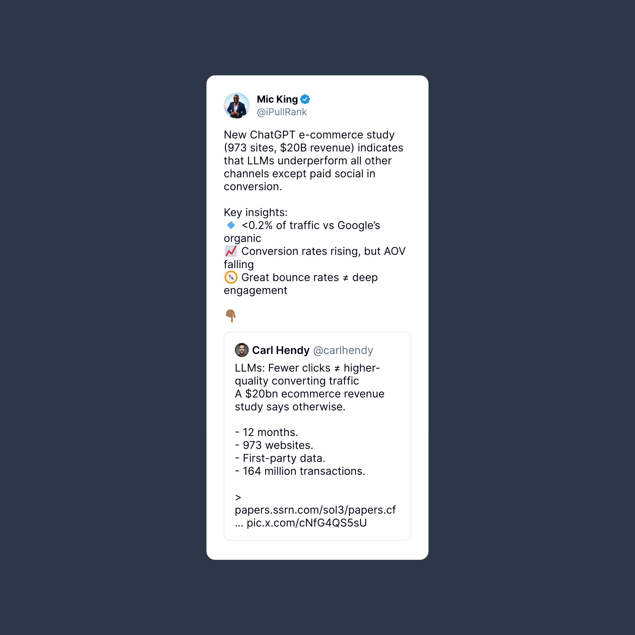 Mic King shares a major e-commerce study analyzing 973 sites with $20B in revenue. The verdict? LLMs underperform all other channels except paid social in conversion.