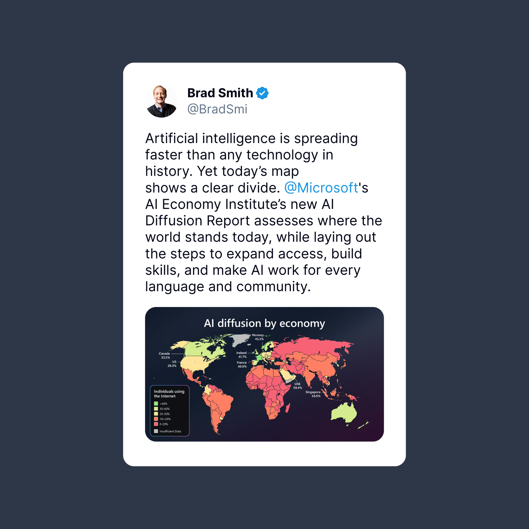 Brad Smith from Microsoft highlights a striking reality. AI is spreading faster than any technology in history, yet there's a clear divide in who's actually using it. Microsoft's AI Economy Institute's new AI Diffusion Report maps out where the world stands today and shows the steps needed to expand access, build skills, and make AI work for every language and community.