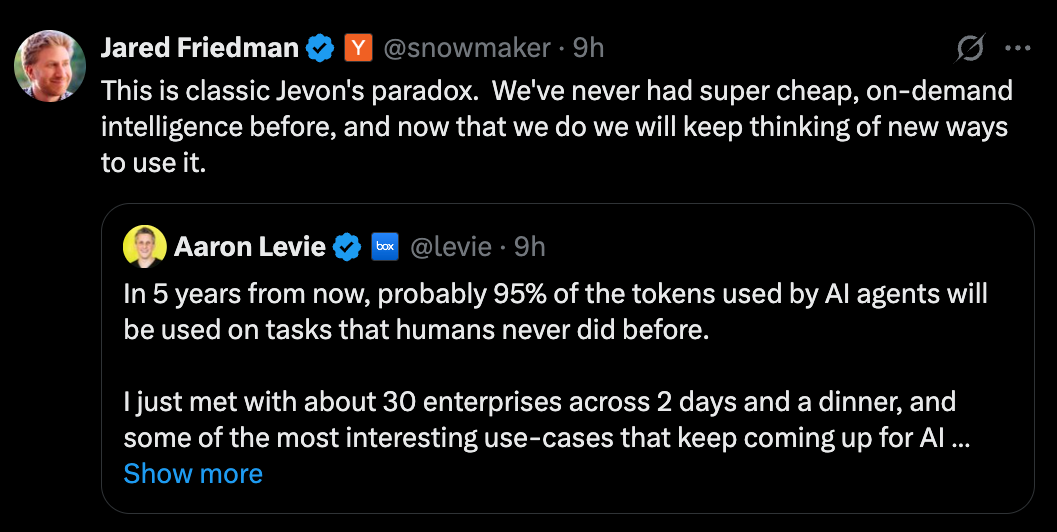 Jared Friedman and Aaron Levie remind us that when intelligence gets cheaper, we use more of it. Levie predicts that 95% of AI tokens in five years will go to tasks humans never did before, unlocking whole new categories of work that once seemed impossible.