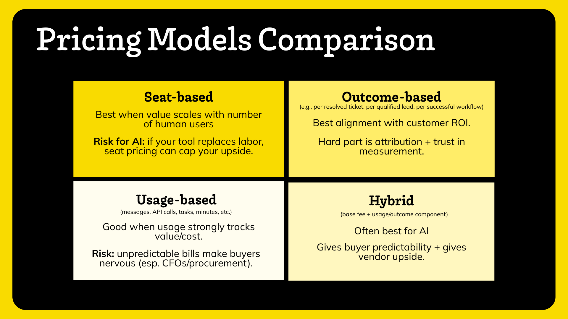 Usage-based: Best when usage tracks value/cost (support, voice, API). Risk: unpredictable bills can scare finance.