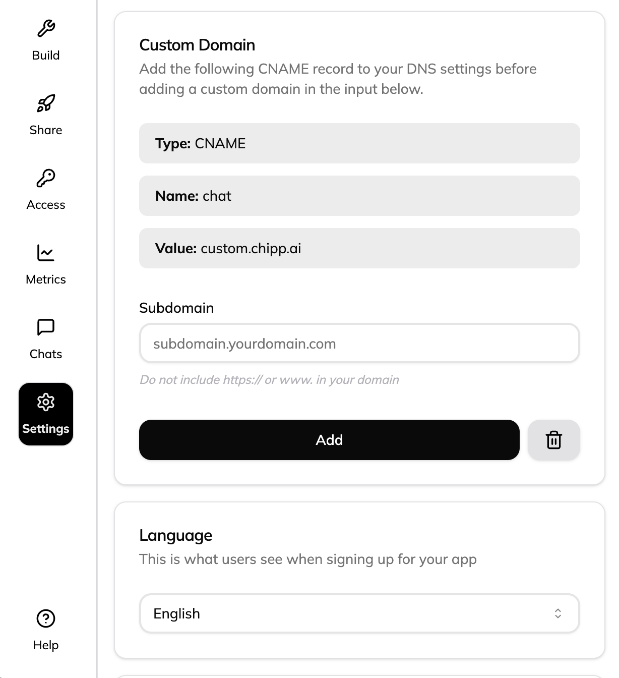 - Return to Chipp.ai to input your saved custom domain (e.g. chat.scottdavidmeyer.com)