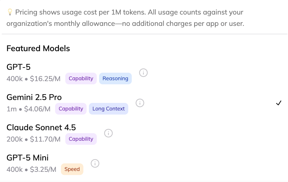 Use the right model for each job. Need a quick answer to "What's your return policy?" Use a fast, affordable model. Need to research competitors, analyze data, or provide personalized recommendations? Use the most powerful models available. You're not locked into one-size-fits-all. And you can use your monthly tokens on any model.